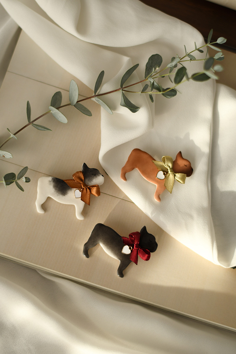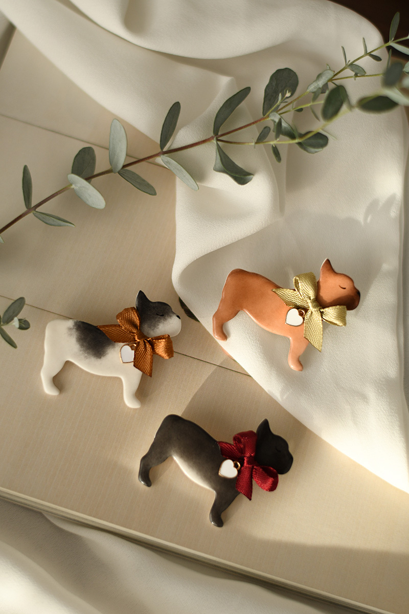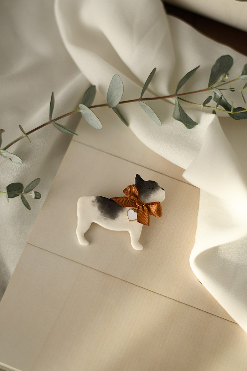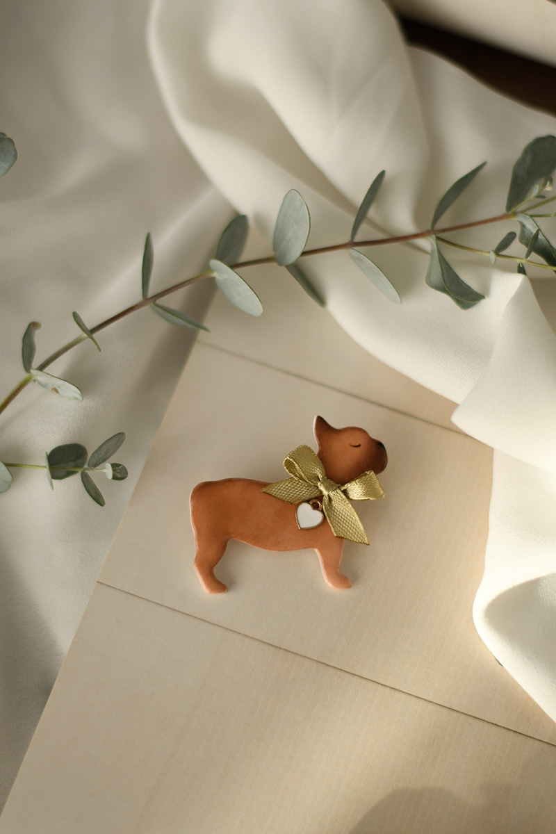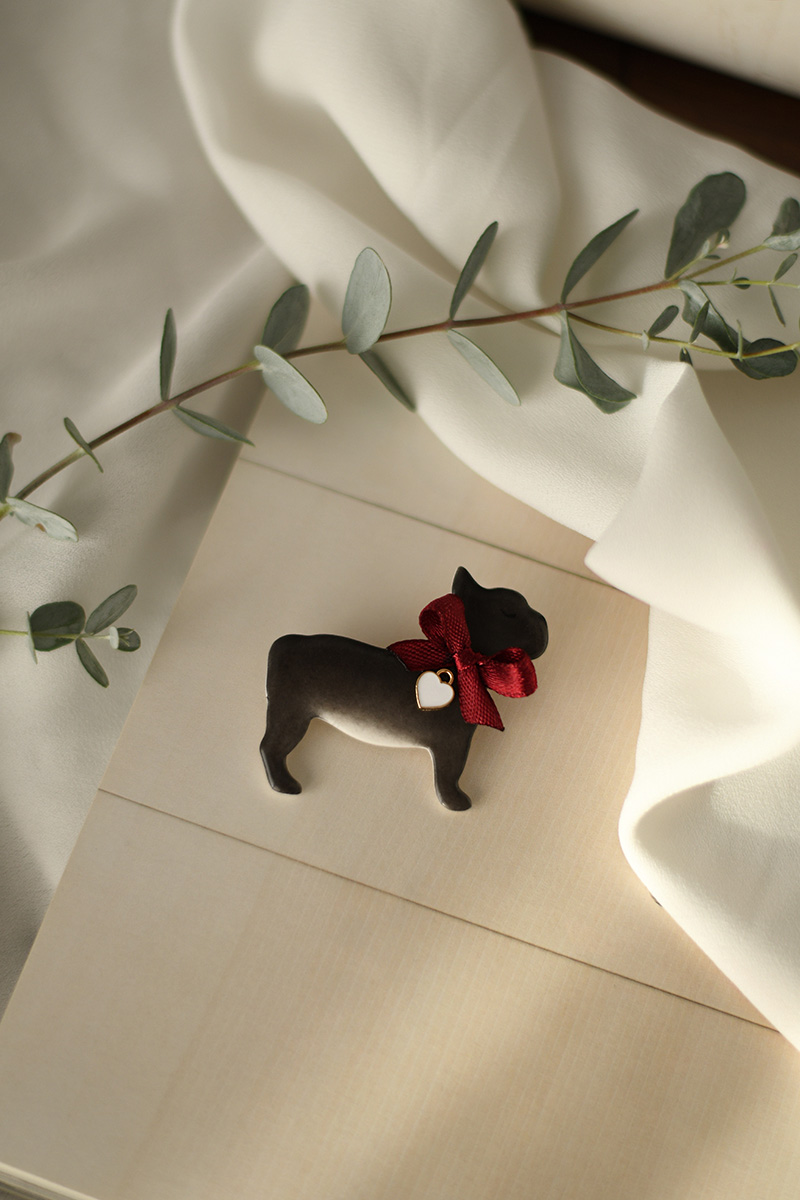 Brošňa francúzskeho buldočka s mašľou a príveskom v tvare srdiečka.