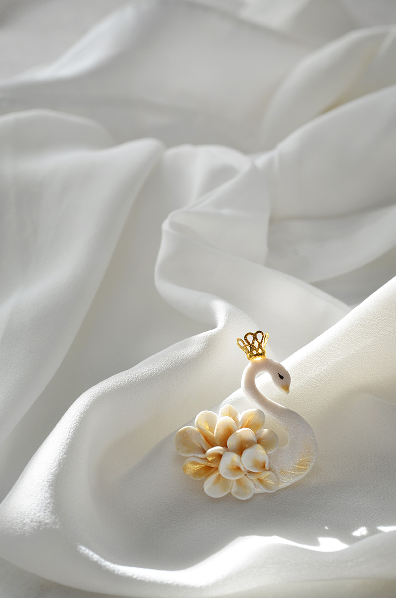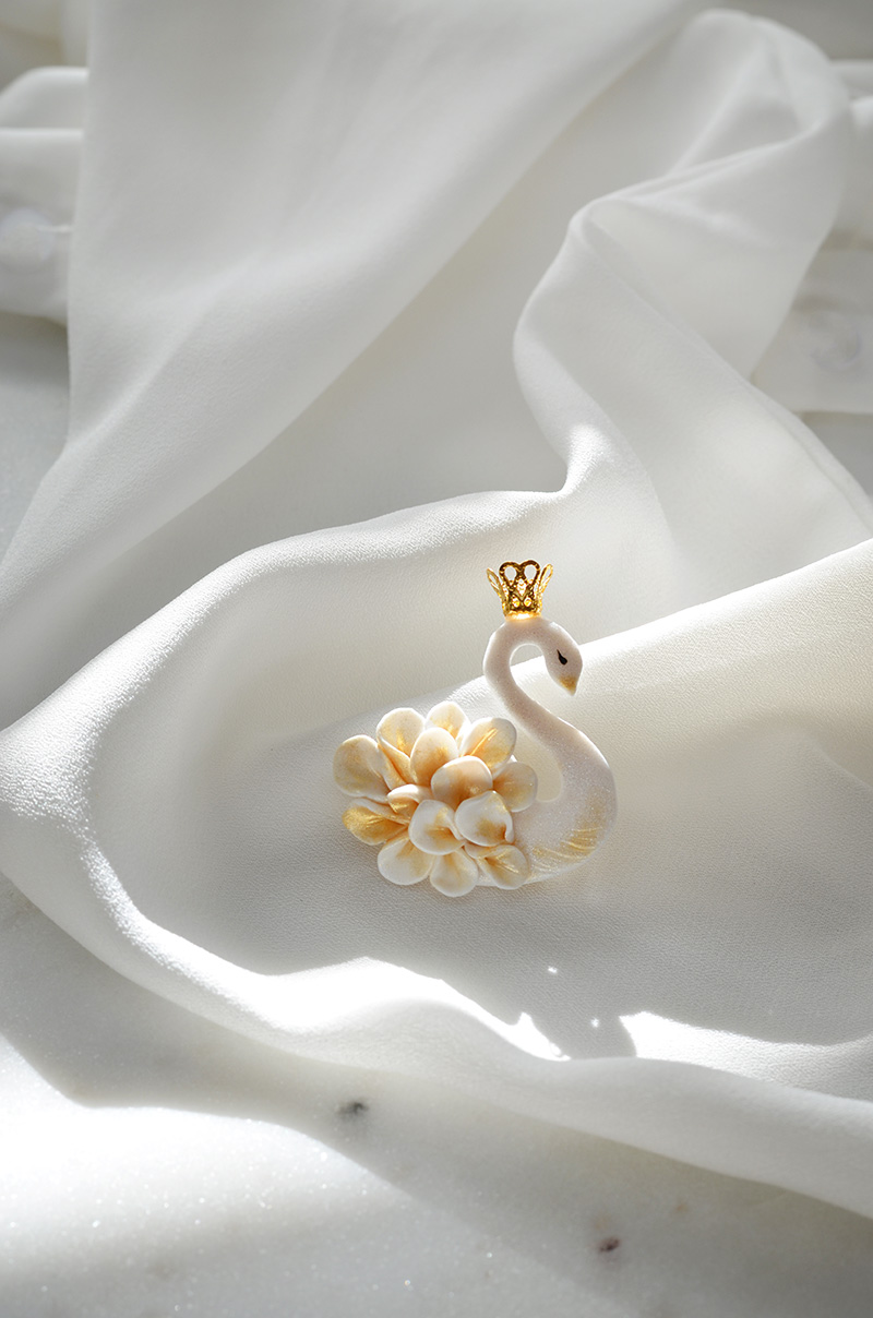 Brošňa GOLDEN SWAN je ručne vyrobená z polymérovej hmoty.