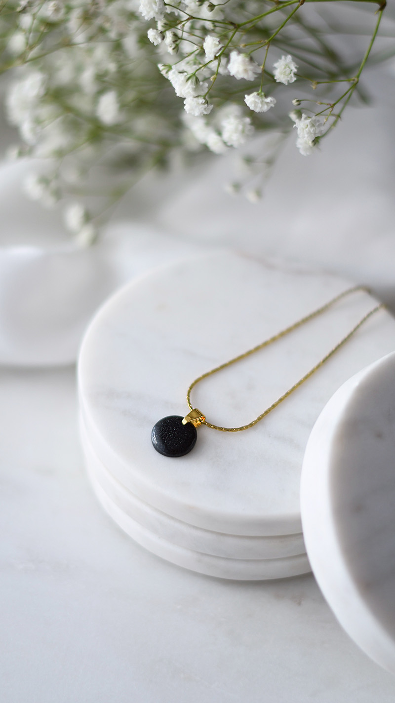 Jemný a elegantný náhrdelník „Dots“ v čiernej farbe s trblietkami, pripomúnajúcimi nočnú oblohu.