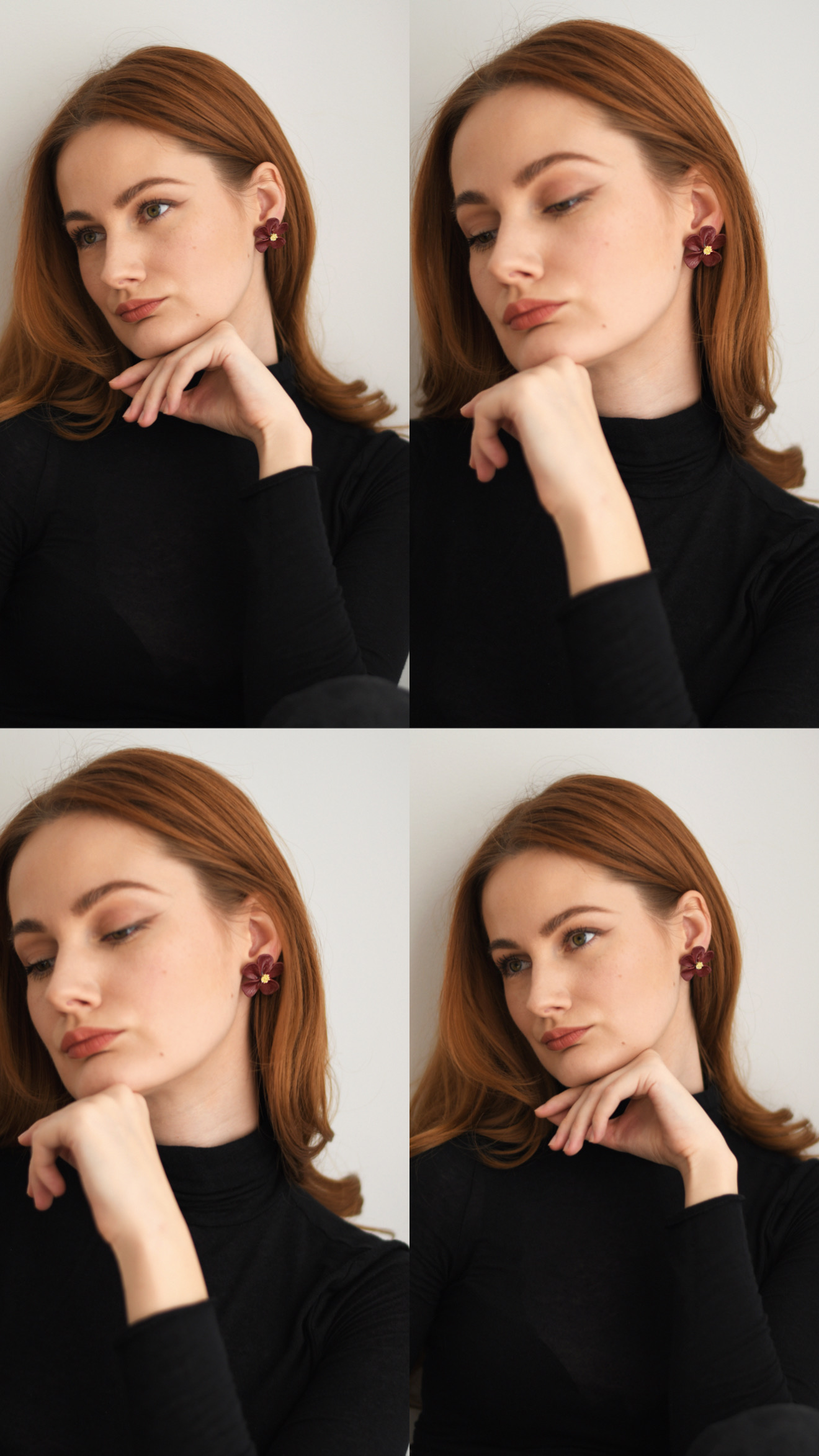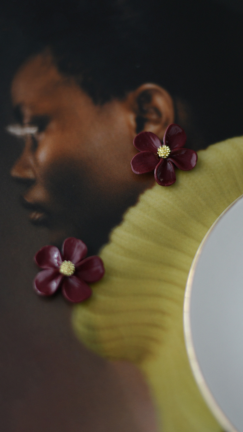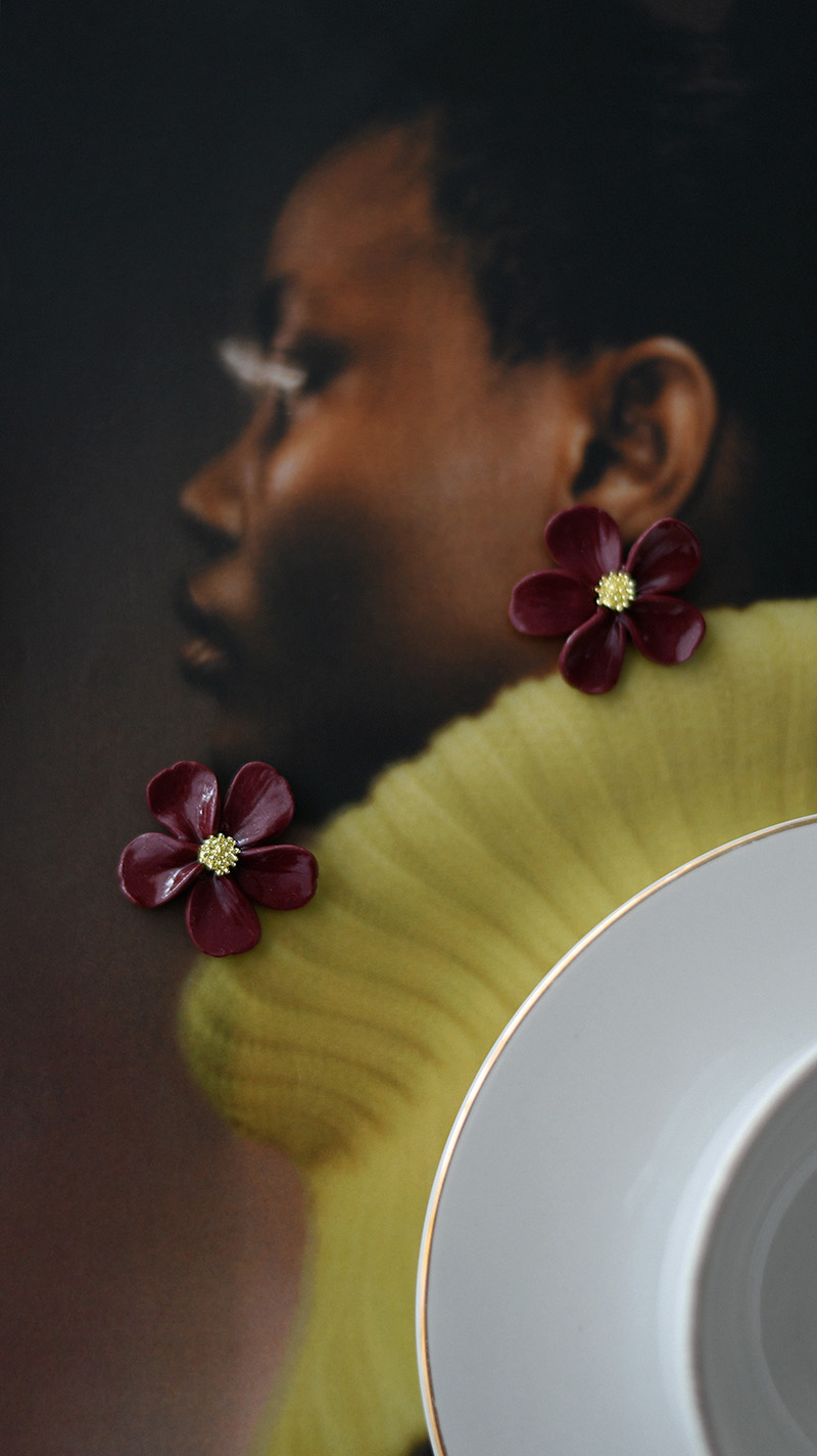 Napichovacie náušnice Flora Burgundy sú ručne vyrobené z polymérovej hmoty v tvare kvetu.