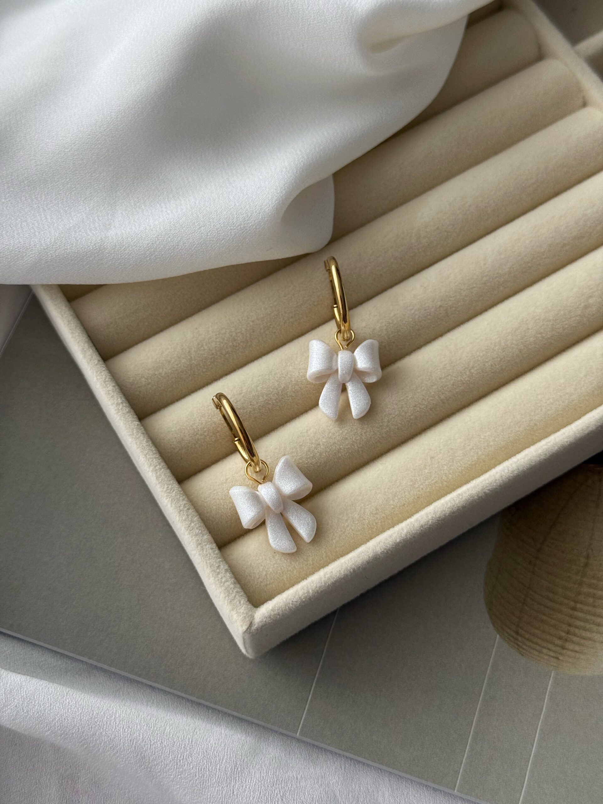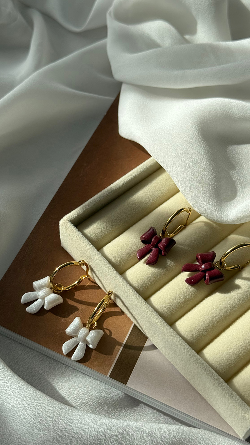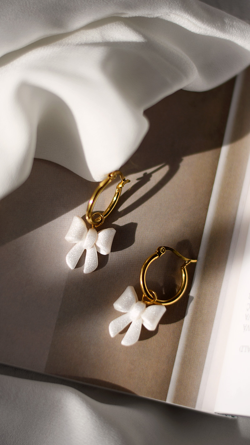 Kruhové náušnice sú z chirurgickej ocele, doplnené o malú mašličku z polymérovej hmoty v perleťovo bielej farbe.