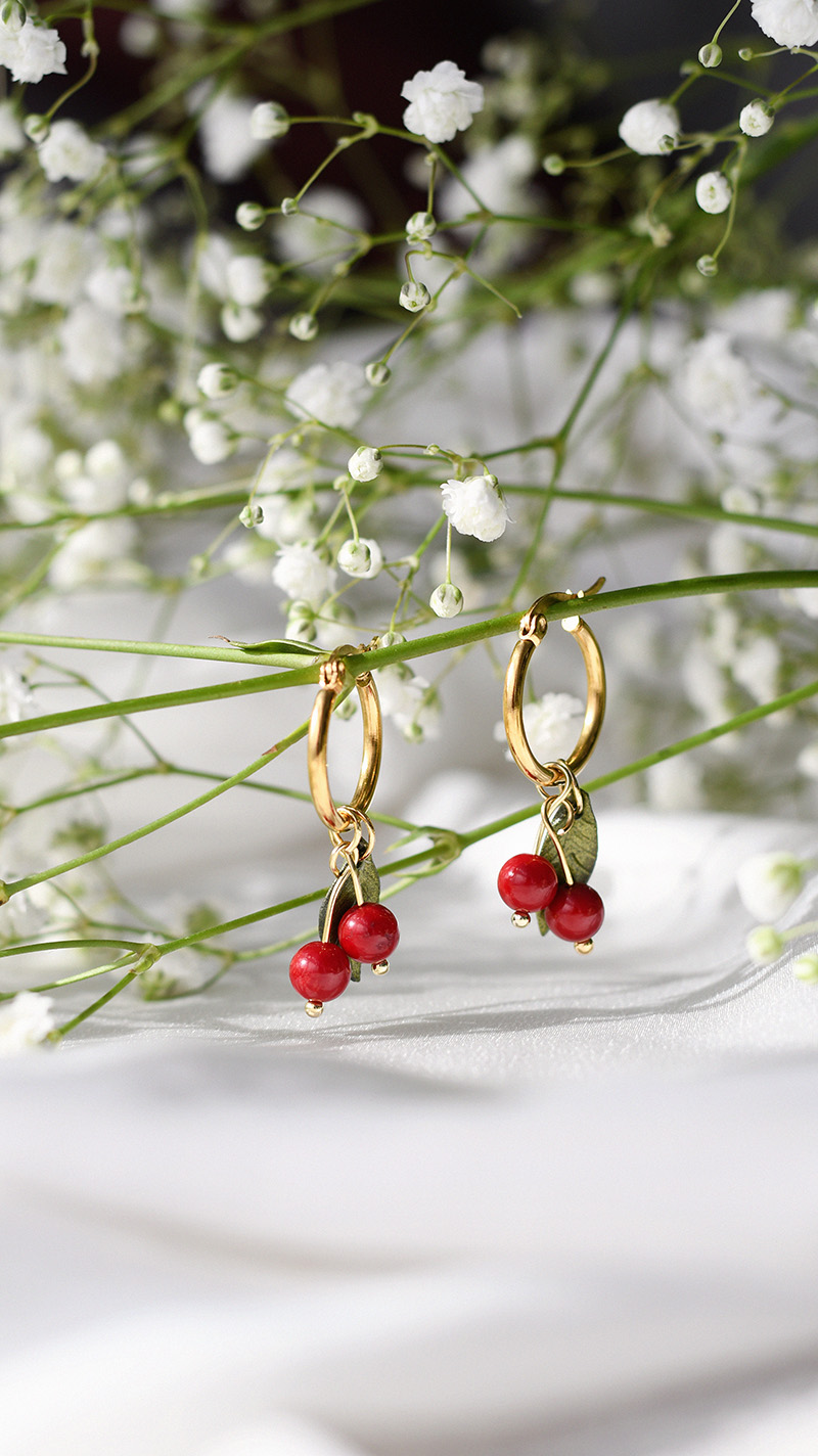 Čerešnové náušničky s polymérovým lístkom a červenými korálkami.
