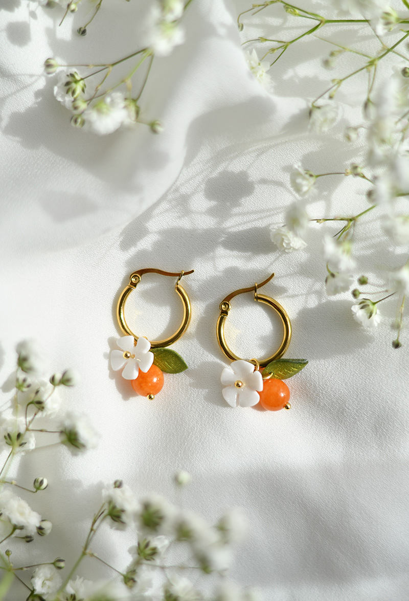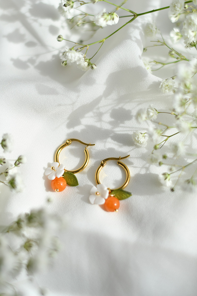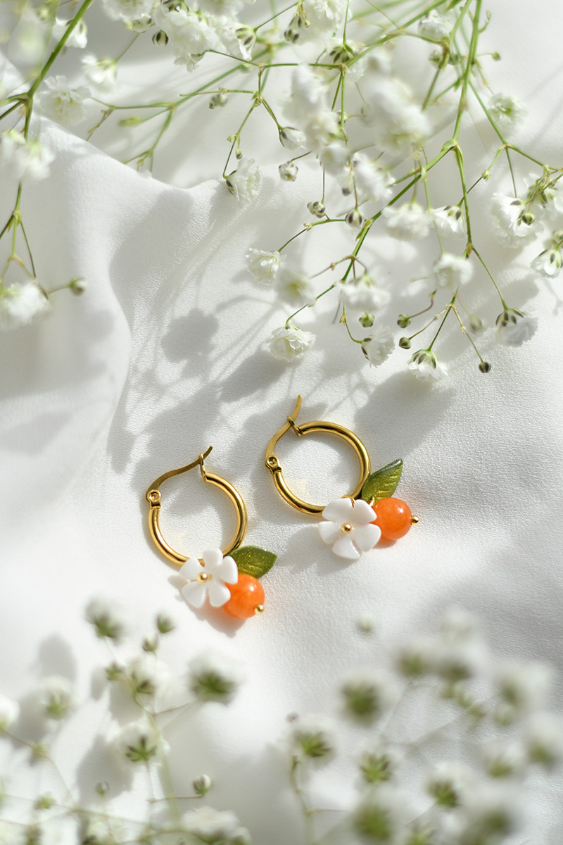Mandarinkové náušničky s ručne robeným polymérovým lístkom a kvietkom.