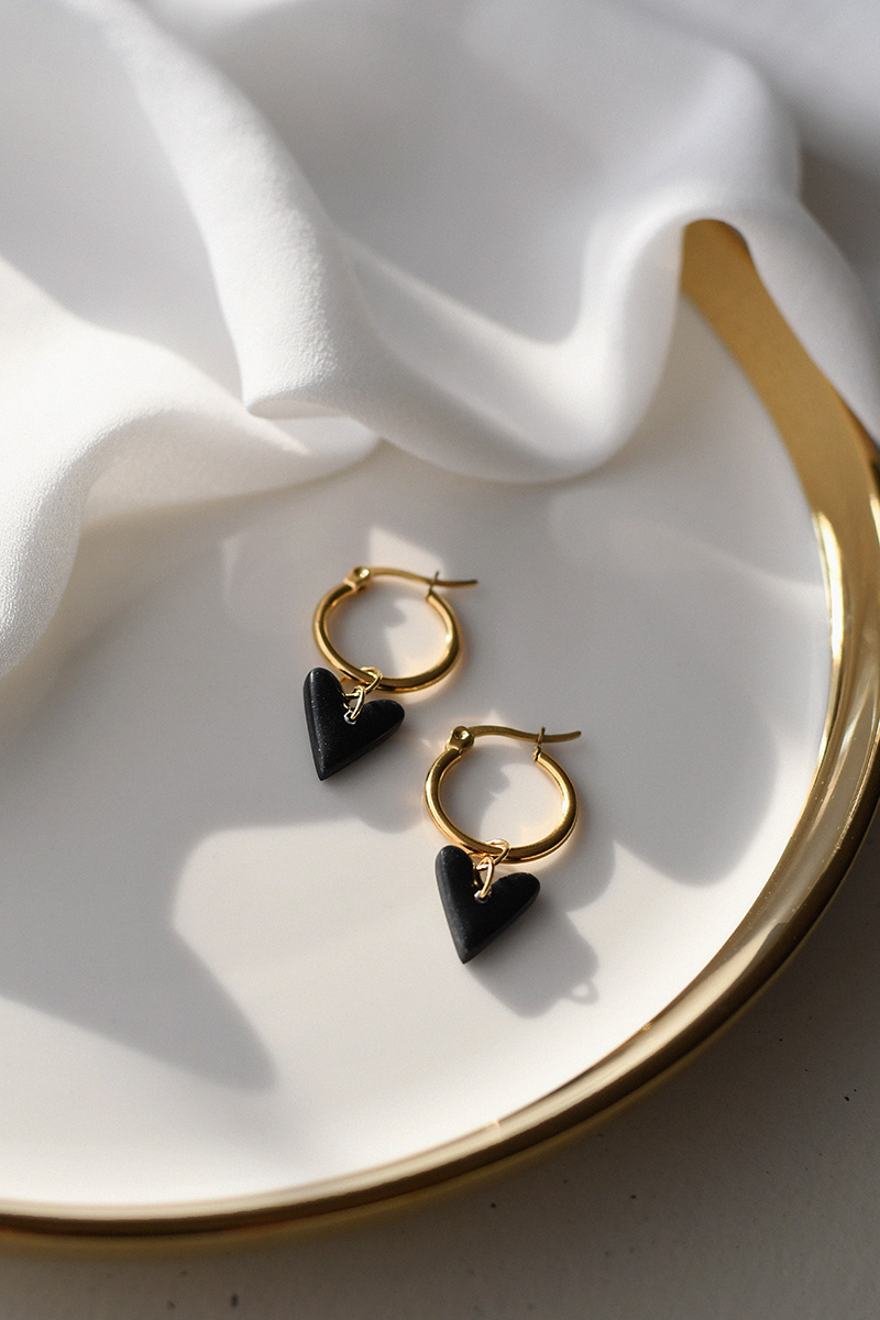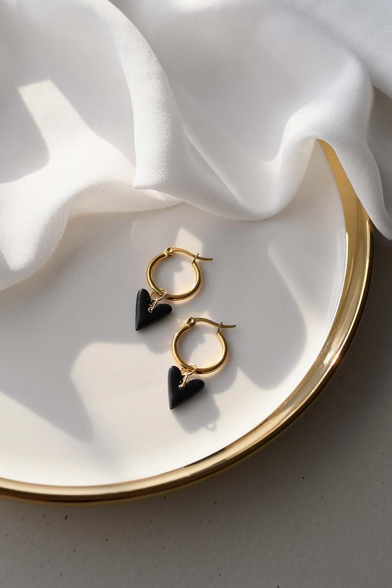 Kruhové náušnice sú z chirurgickej ocele, doplnené o malé polymérové srdiečko čiernej farby.