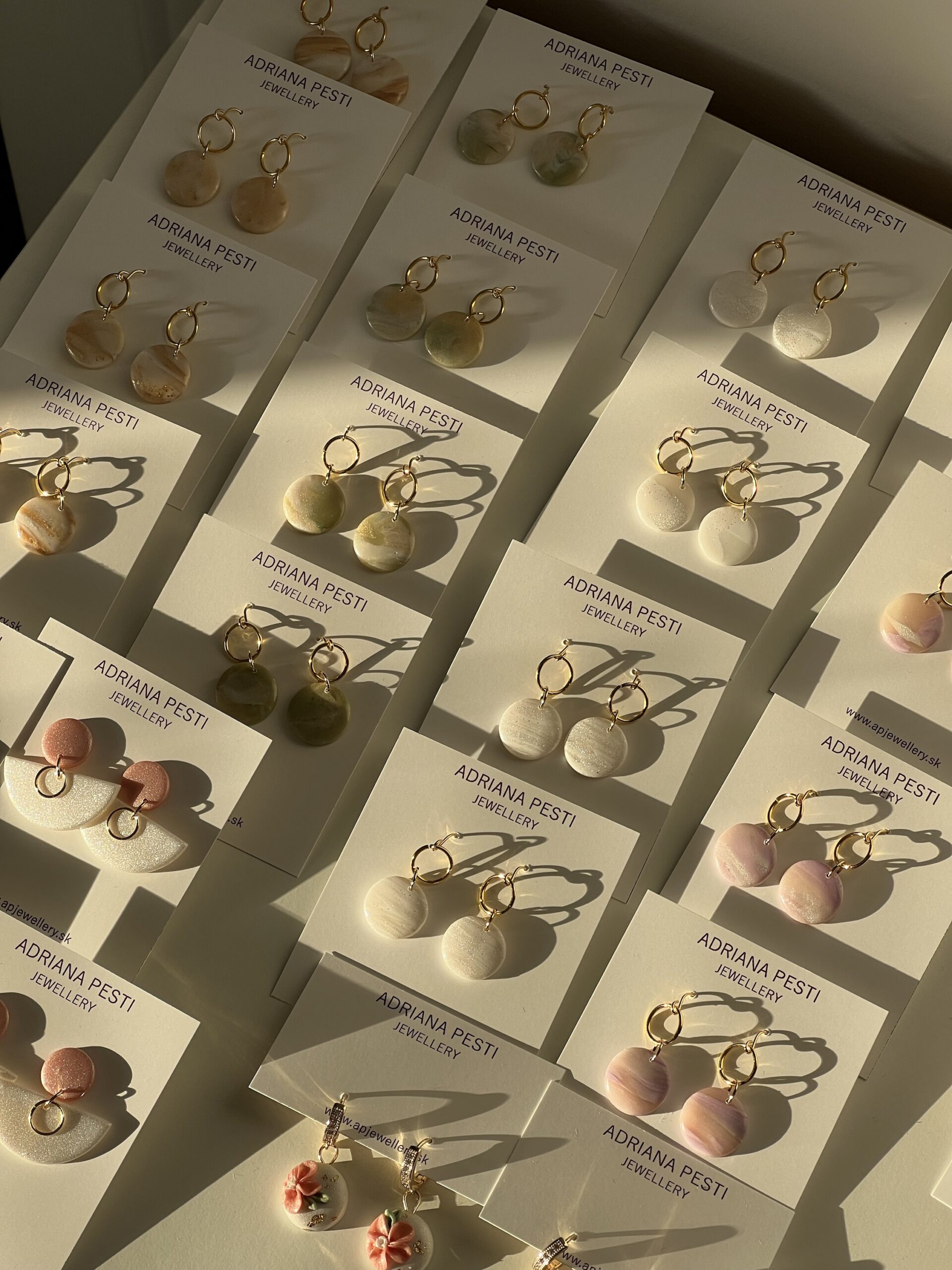 Visiace náušnice LIA sú ručne vyrobené z polymérovej hmoty.